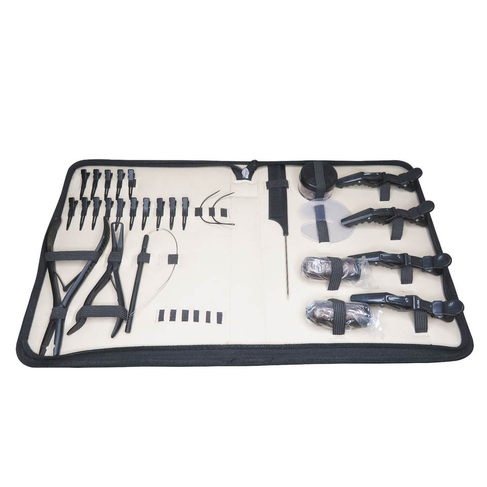 Kit d'outils pour extensions capillaires en métal noir mat : pinces crocodiles, micro-perles, étui à boucles, micro-aiguilles, ciseaux