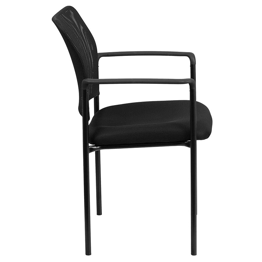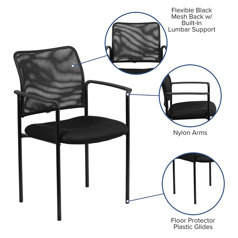 Chaise en maille noire avec bras en nylon, cadre en acier empilable et support lombaire intégré