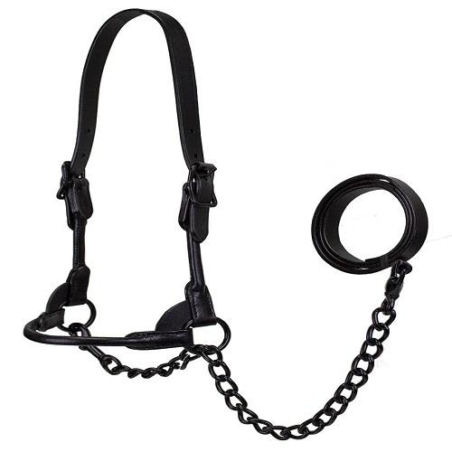 Noir Minuit Tout Noir Premium Rond Roulé En Cuir Bovin Show Halter Avec Chaîne Assortie Plomb pliant saisonnier intelligent