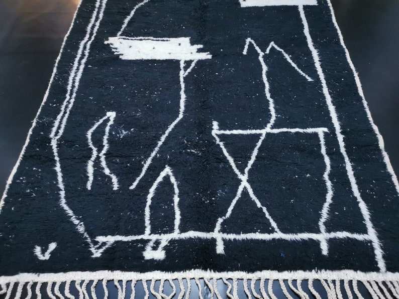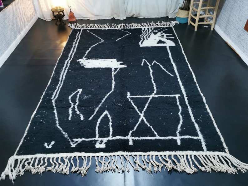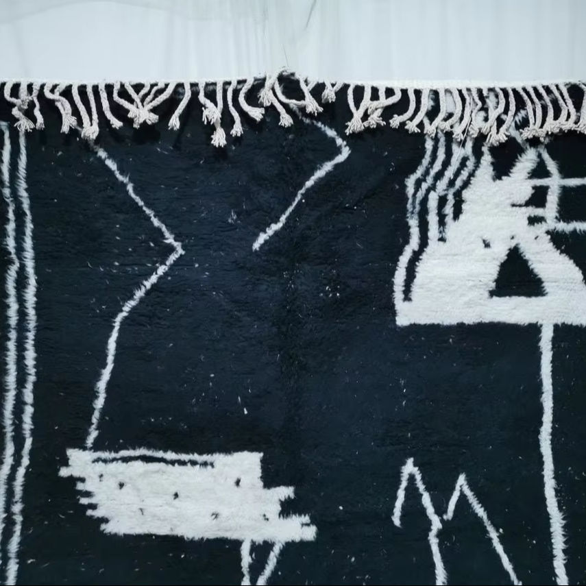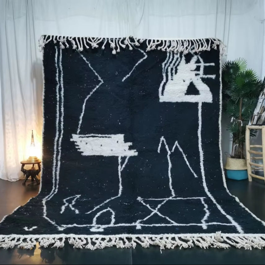 Tapis marocain noir fait à la main Beni Ourain motif géométrique tapis noir zone berbère bohème hiver laine tapis salon moderne
