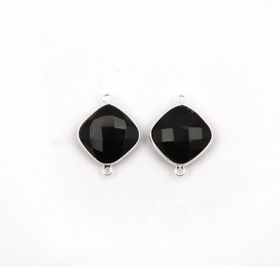 Onyx noir pierre précieuse coussin forme 16 mm coussin Double caution Bracelet breloque connecteurs argent 925 lunette pierre noire