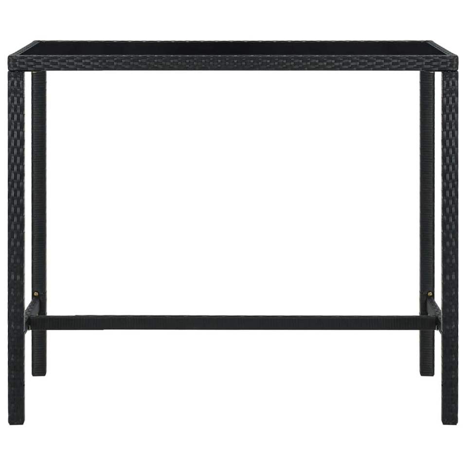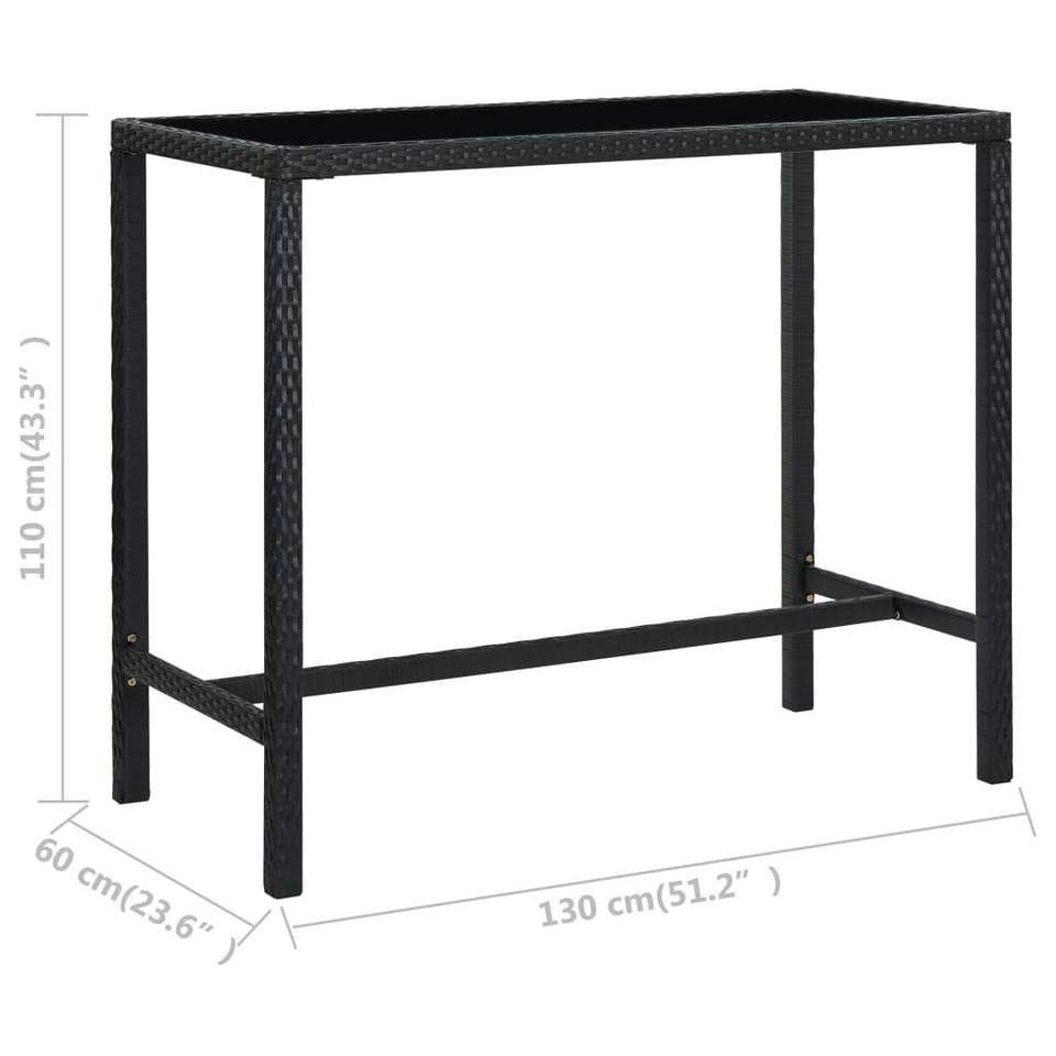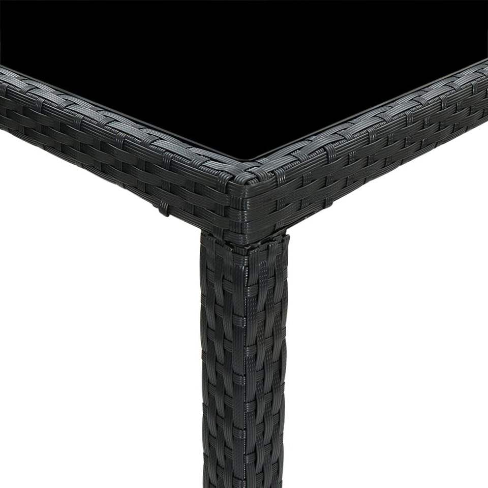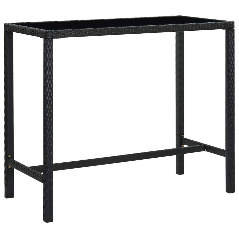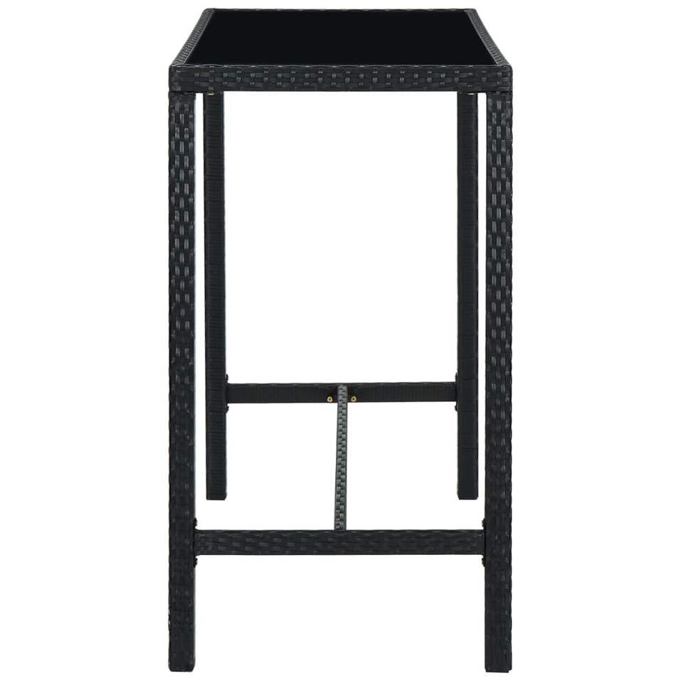 Table de bar en rotin PE noir avec structure en acier thermolaqué et plateau en verre trempé pour usage extérieur