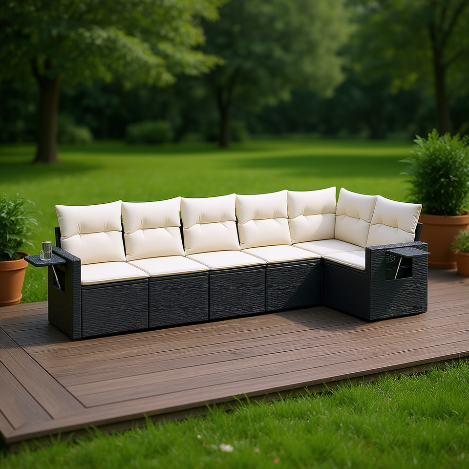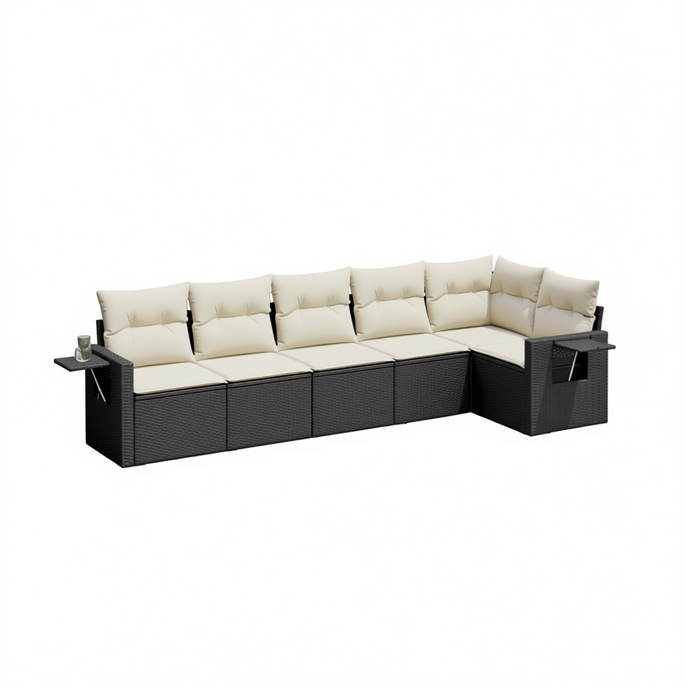 Ensemble de canapé de jardin en rotin PE noir avec coussins blanc crème, mobilier d'extérieur au design élégant