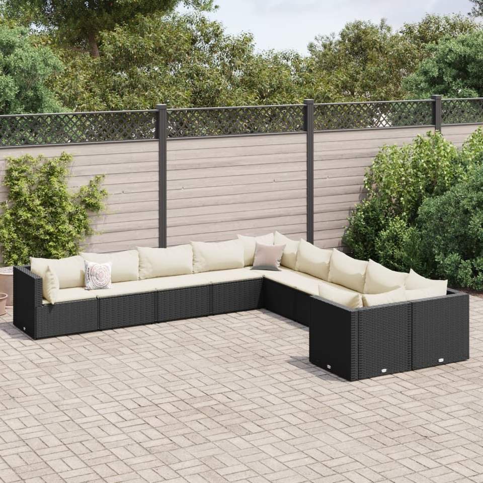 Ensemble de canapés de patio noirs avec coussins crème, 10 places, mobilier de jardin extérieur en rotin, design contemporain, résistant aux intempéries