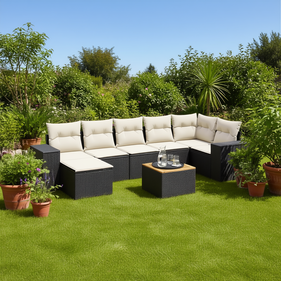 Ensemble de canapés de jardin en rotin noir avec structure en acier thermolaqué et bois d'acacia, mobilier d'extérieur haut de gamme
