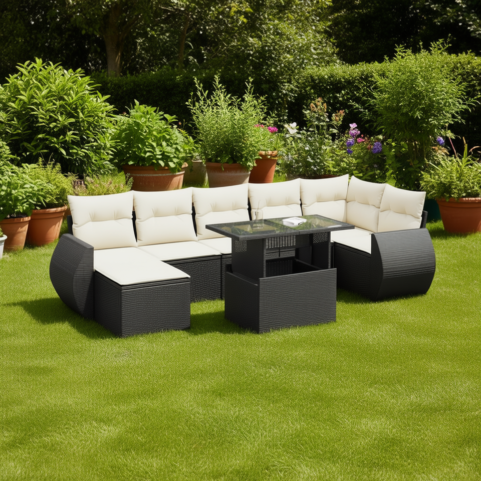 Ensemble de canapés de jardin en rotin noir avec coussins, mobilier d'extérieur au design contemporain pour patio et jardin