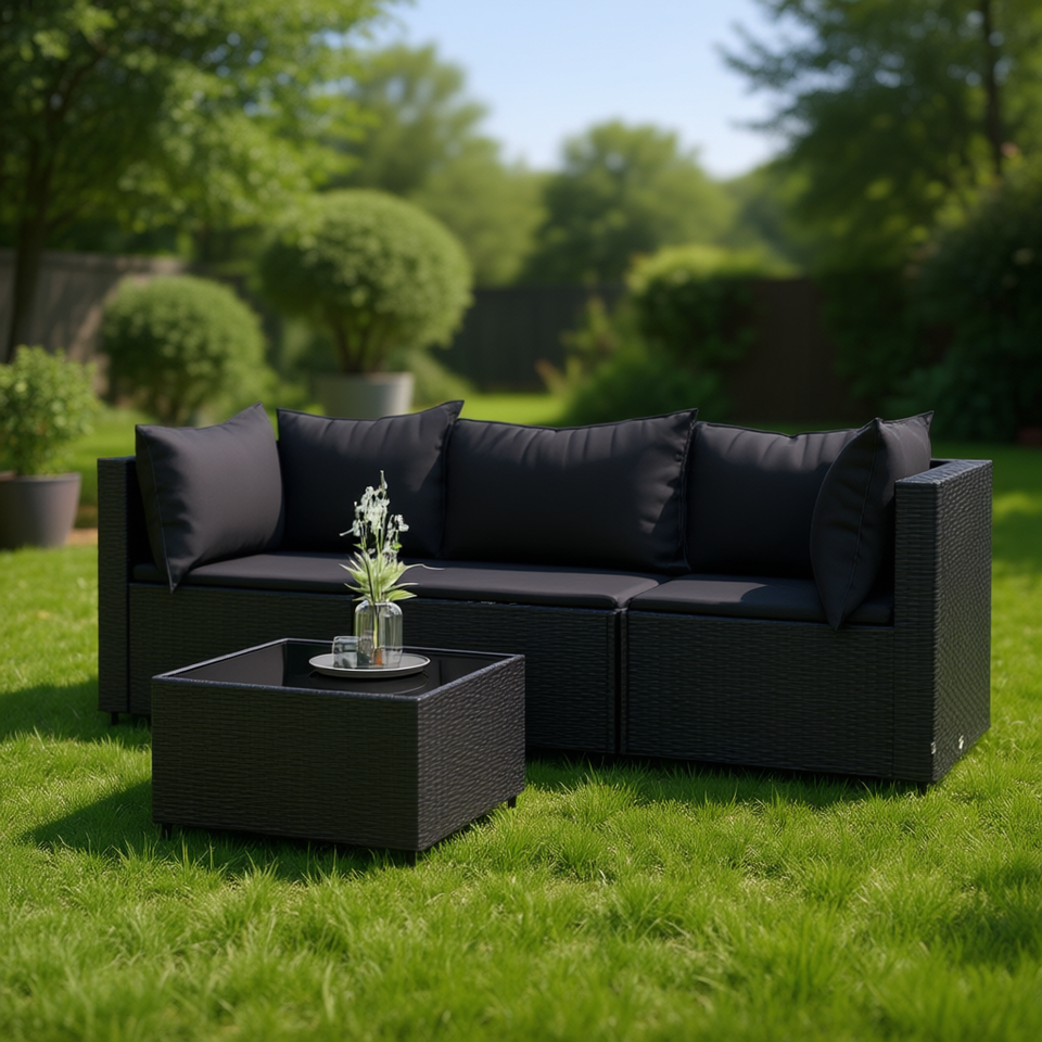 Ensemble de salon de jardin en rotin noir avec structure en acier thermolaqué et verre trempé pour usage extérieur