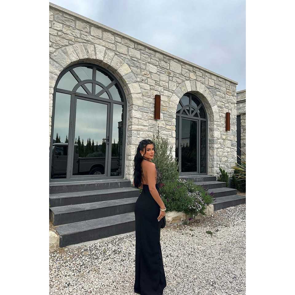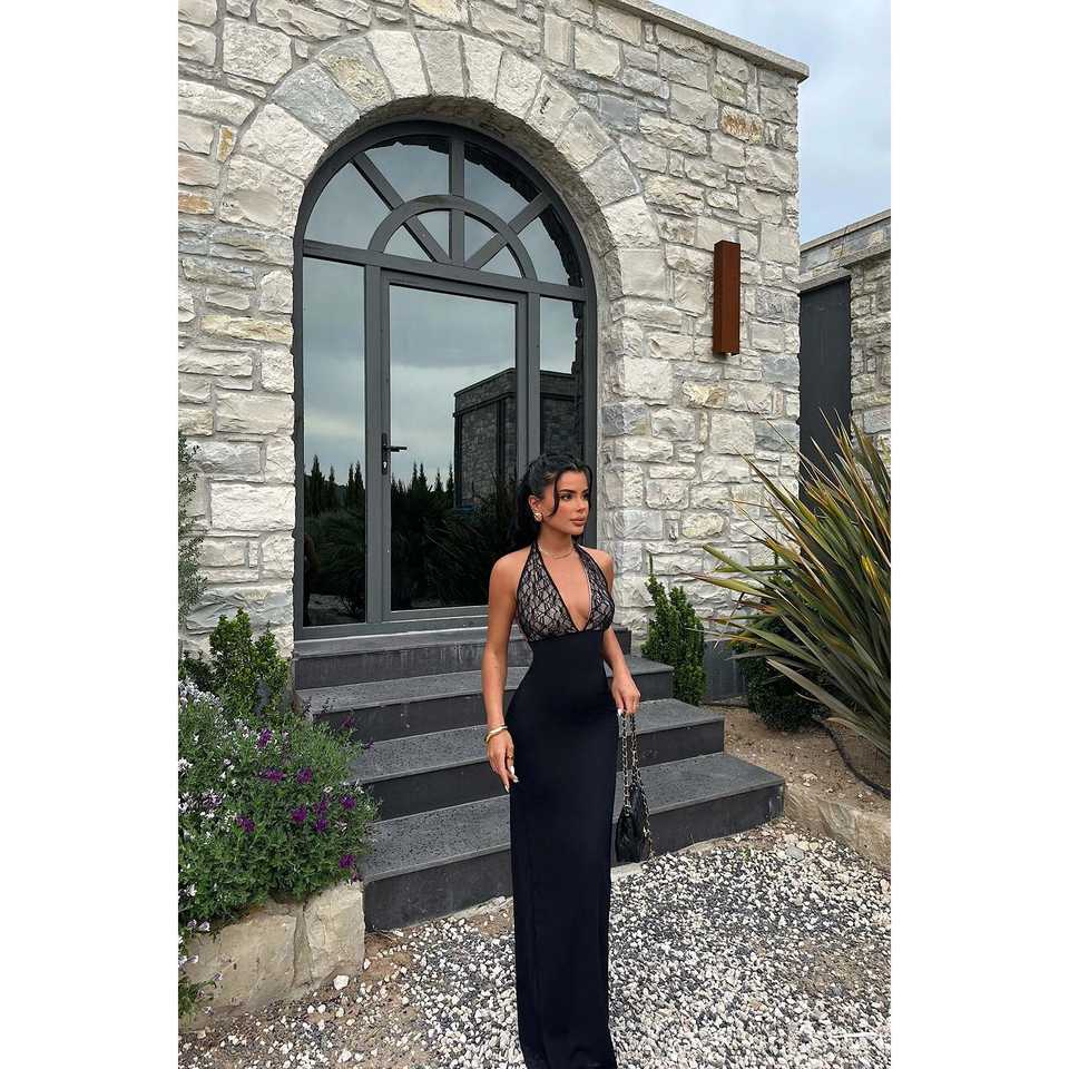 Robe de soirée longue noire Perri avec détails en dentelle et fente arrière à sequins, style formel pour mariages et banquets