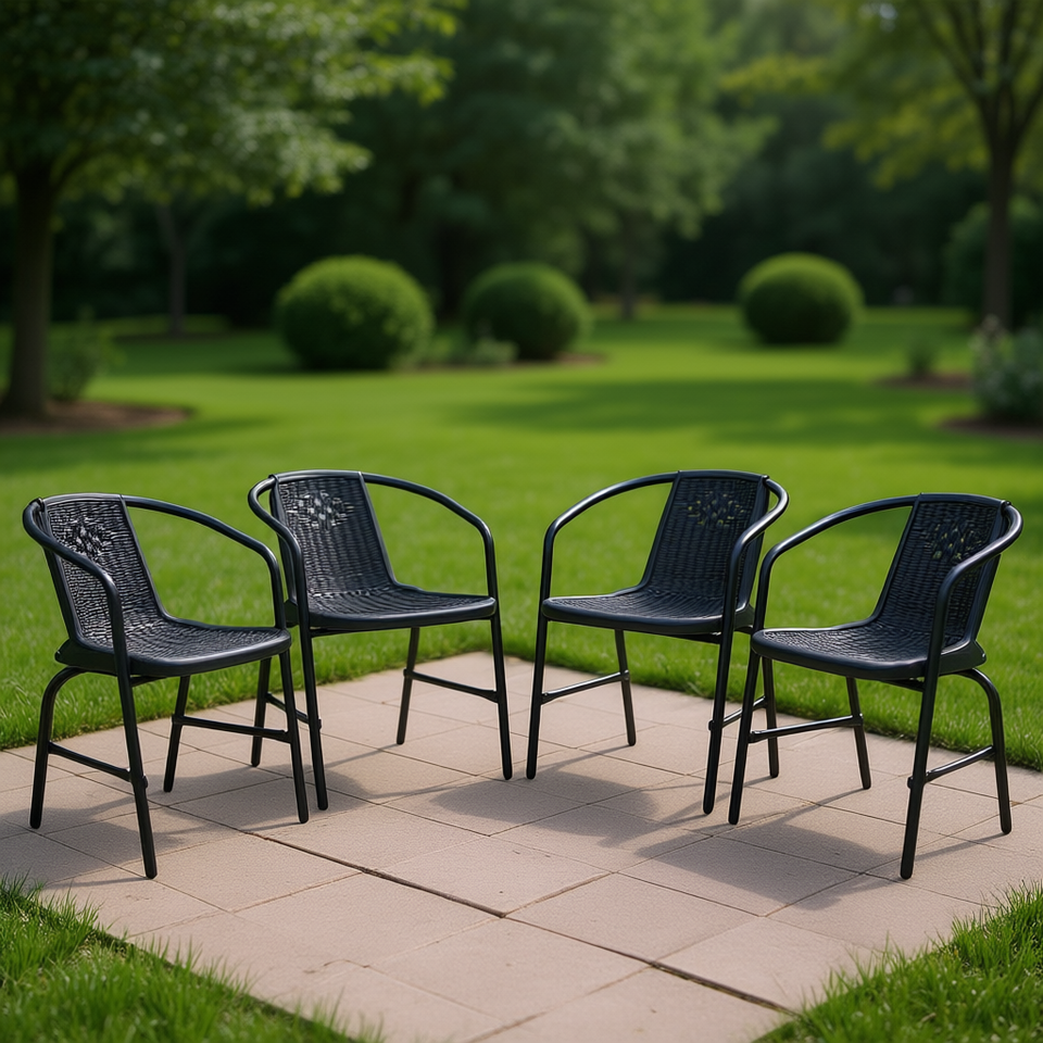 Chaises de jardin en rotin plastique noir, structure en acier, empilables, ensemble de 8 meubles d'extérieur, design contemporain, pieds coniques