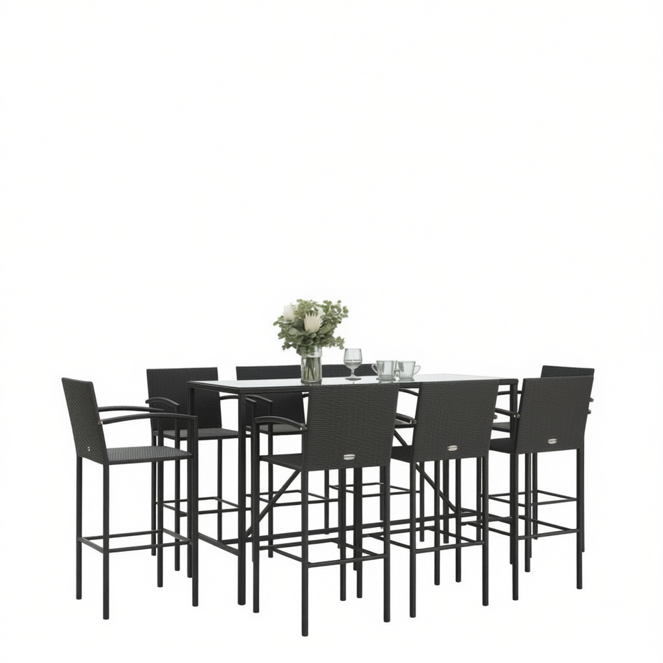 Ensemble de bar de jardin en polyrotin noir avec verre trempé, 6 places, mobilier d'extérieur au design contemporain