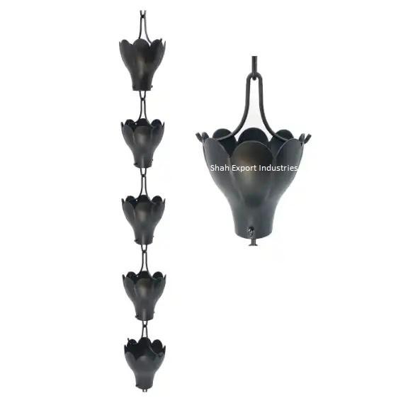 Chaîne de pluie de tasse de fleur de fer faite à la main enduite de poudre noire chaîne de pluie décorative de jardin pour la décoration de maison et de jardin