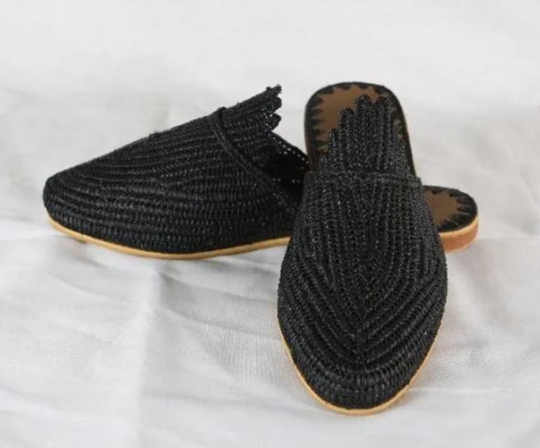 Mules en raphia noir : Chaussures marocaines pointues faites à la main