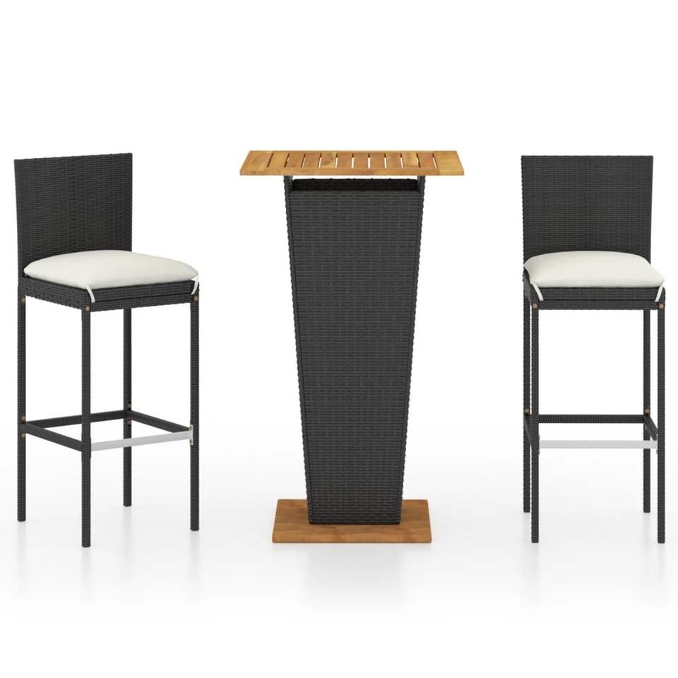 Ensemble de bar de jardin en rotin noir avec 2 tabourets, plateau en bois massif, résistant aux intempéries, mobilier d'extérieur au design contemporain