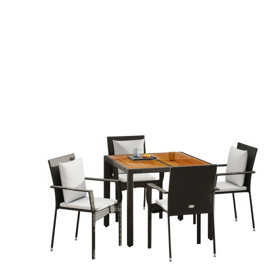 Ensemble de salle à manger de jardin en rotin noir 4 places, table en teck, structure en acier, résistant aux intempéries, mobilier d'extérieur au design contemporain