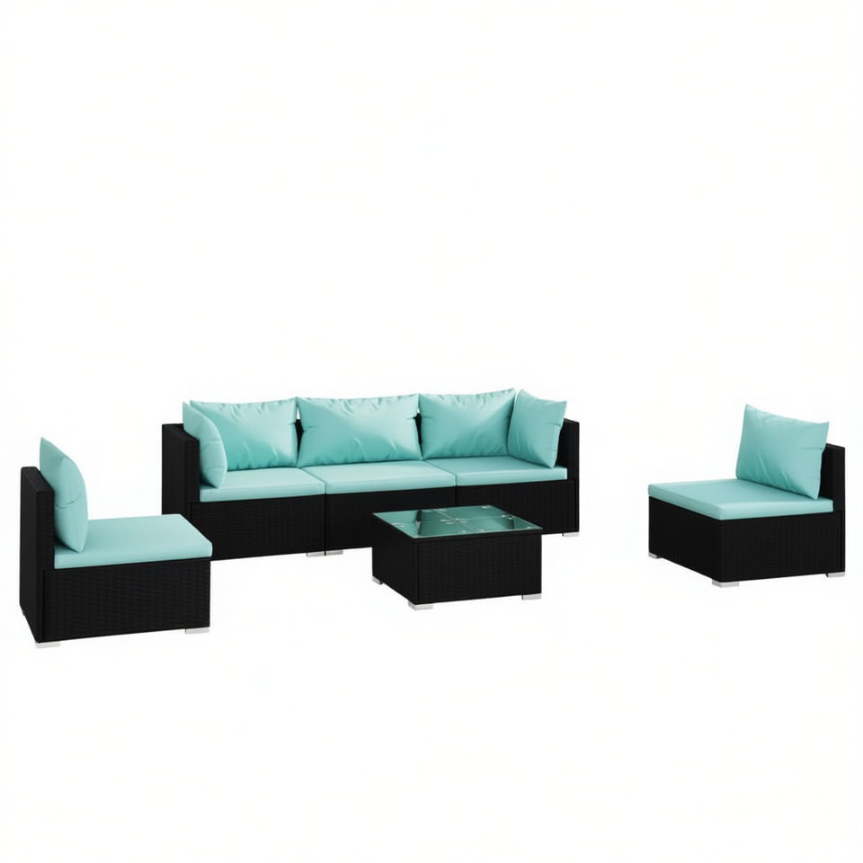 Ensemble de salon de jardin en rotin noir avec coussins bleus, mobilier d'extérieur 4 places, design contemporain, résistant aux intempéries