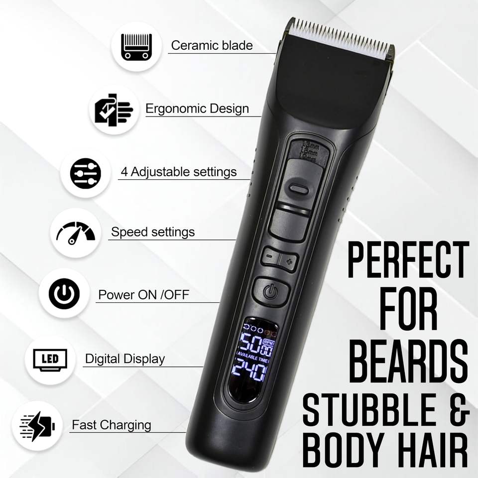 Kit de tondeuse rechargeable noir avec lames en céramique et acier inoxydable réglables, guides de longueur et batterie USB 2500 mAh pour barbier et toilettage