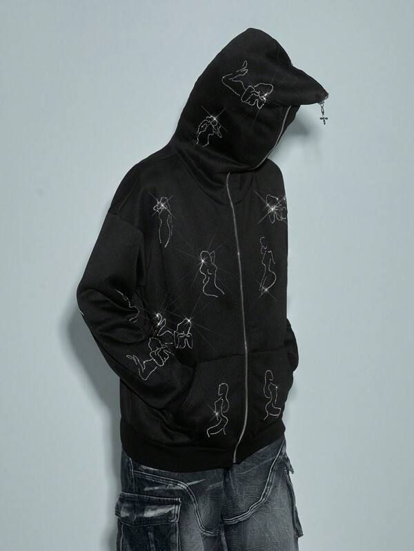 Sweat à capuche noir à coupe classique avec strass pour homme, veste streetwear zippée, motif artistique en cristal, fermeture éclair intégrale, style gothique Y2K, 100% coton, hiver