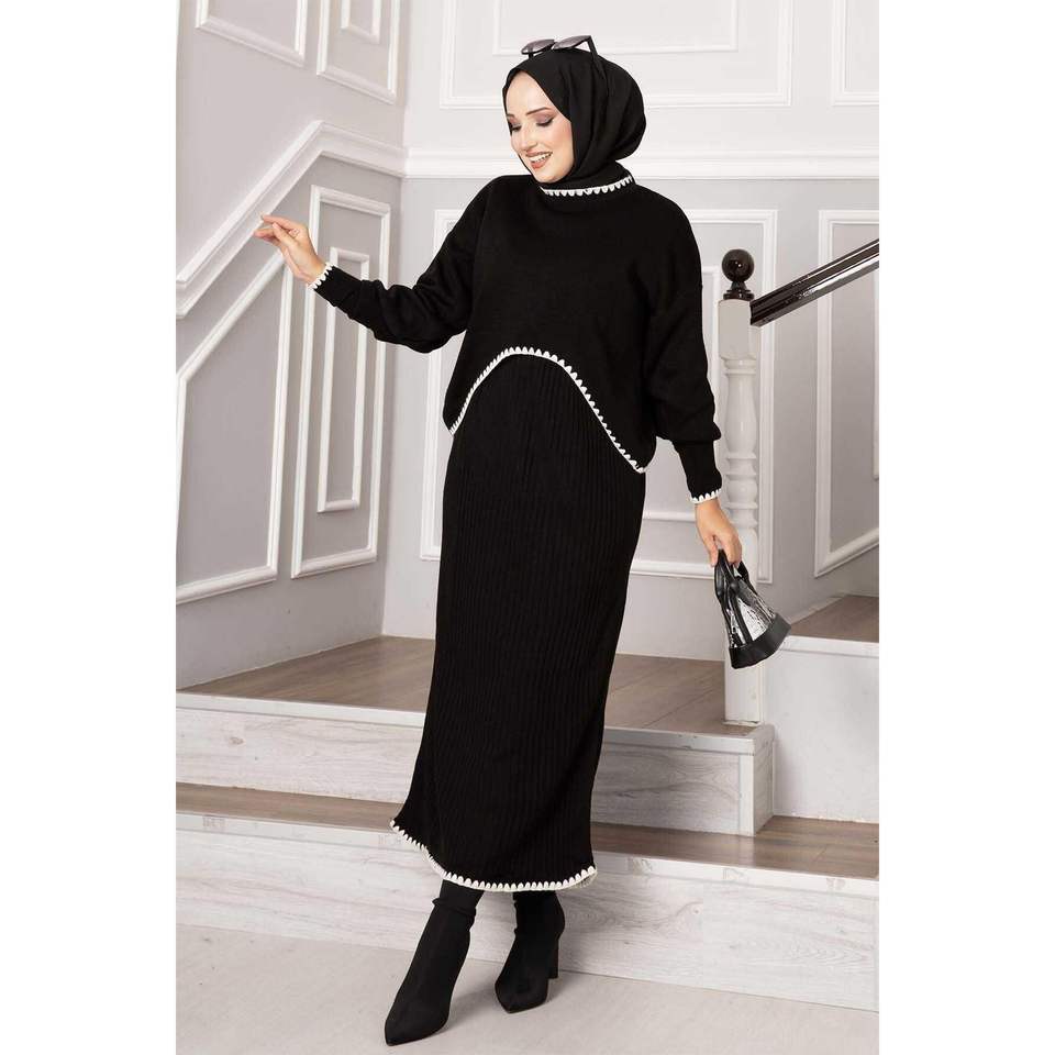 Ensemble 2 pièces modeste à manches côtelées noires avec touche élégante