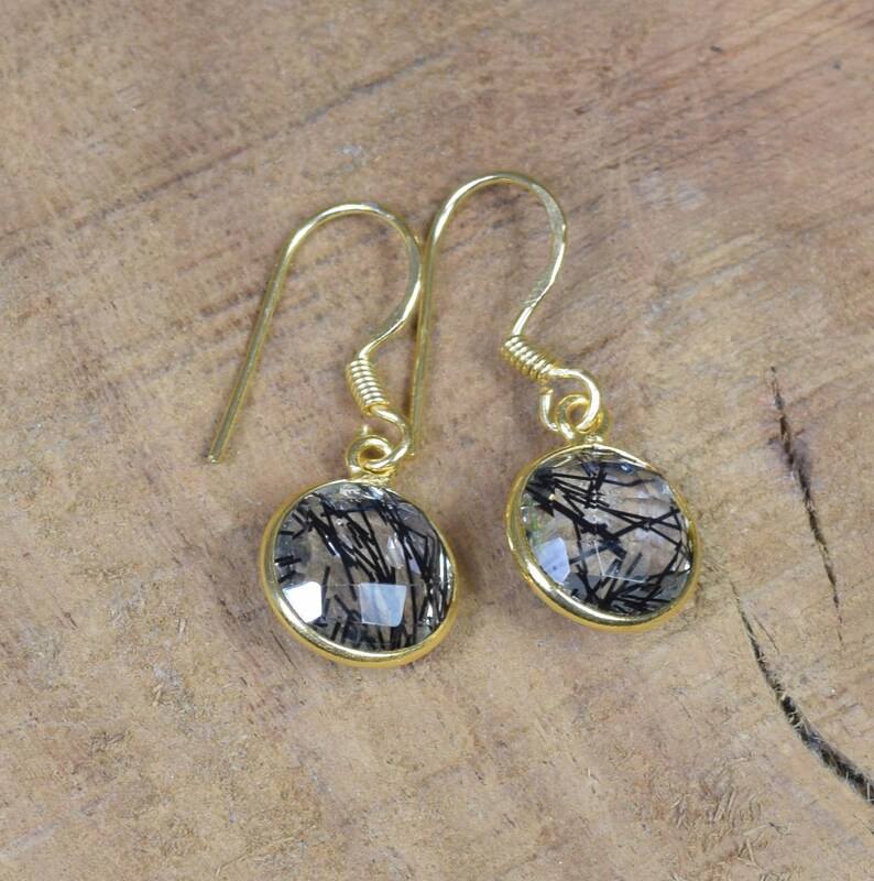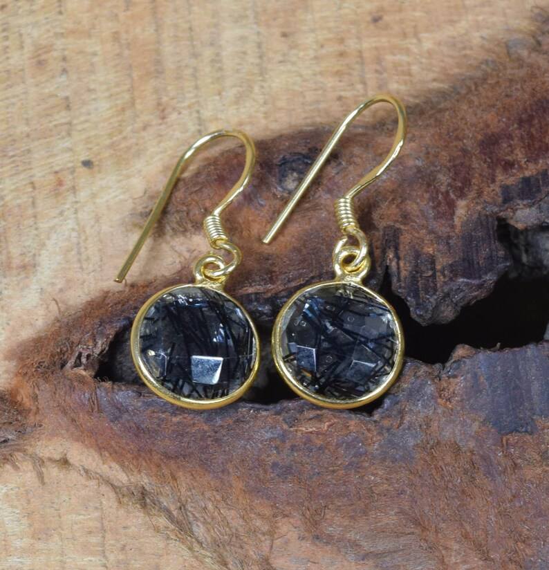Black Rutilated Quartz Earring Sterling Silver with Gold Overlay Handmade Gemstone Jewelry Gift for Her