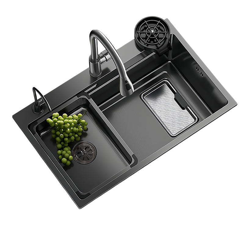 Évier de cuisine noir en SUS304, grand modèle à cuve unique, épaisseur 5,0 mm, avec double système d'évacuation