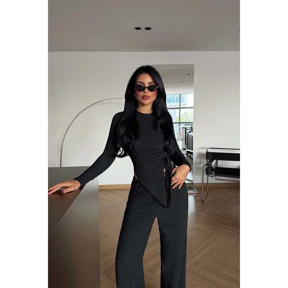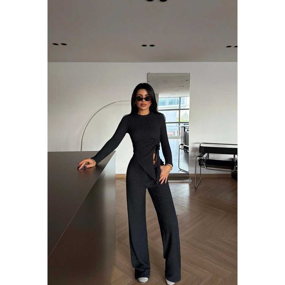 Black Satin Pants Suit for Office Lady Formal and Casual with Button Decoration