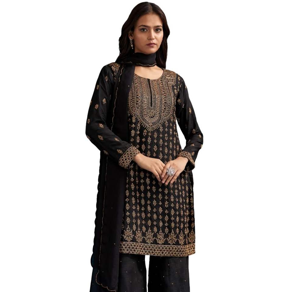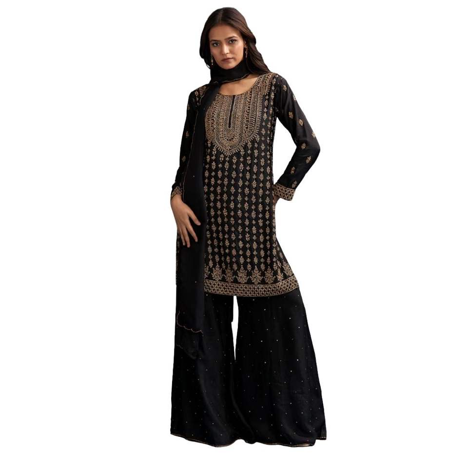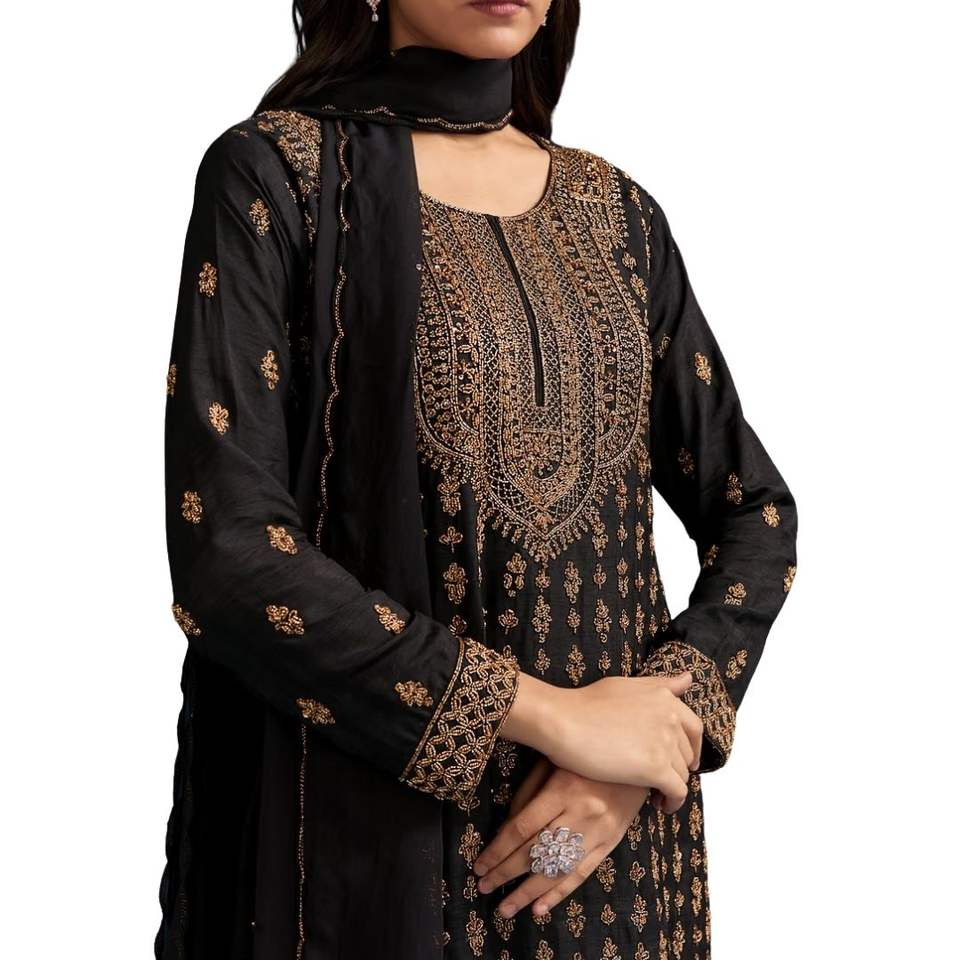 Black Silk Palazzo Suit With Embroidered Cut Dana Work And Dupatta Wholesale Women Ethnic OEM Clothing Factory Bulk Supplier