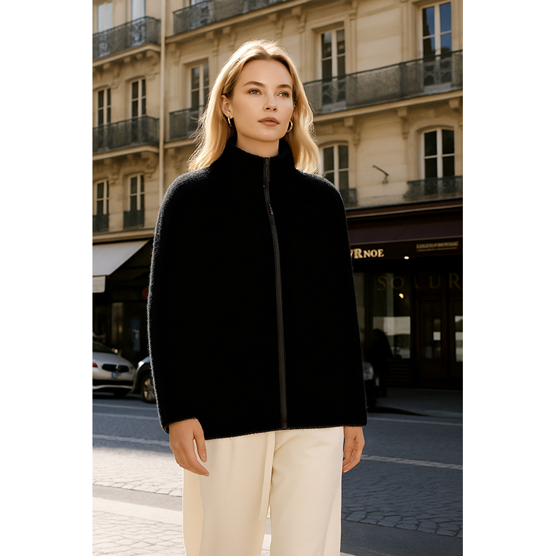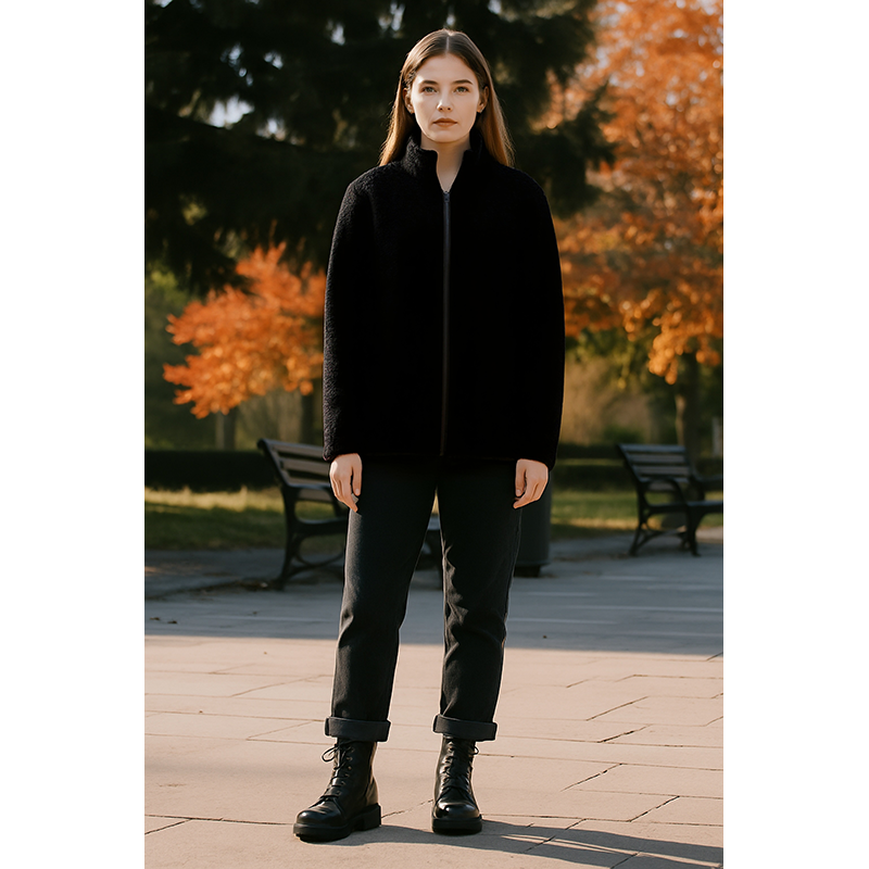 Manteau décontracté pour femme en polaire texturée à col montant noir avec fermeture éclair, silhouette ample, poche latérale décorative, confortable et chaud