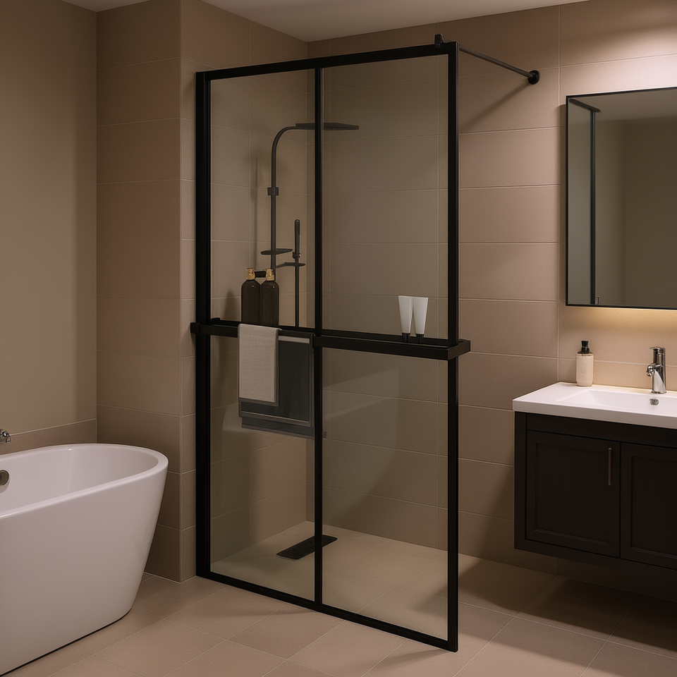 Porte de douche noire à passage libre 46,5x74,8 pouces, verre ESG, cadre en aluminium avec étagère, design coulissant, cabine de douche rectangulaire