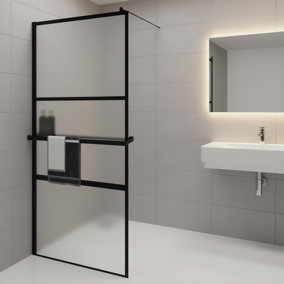 Paroi de douche noire avec porte coulissante 39,4x76,8 pouces, verre ESG, cadre en aluminium avec étagère, design minimaliste pour salle de bain