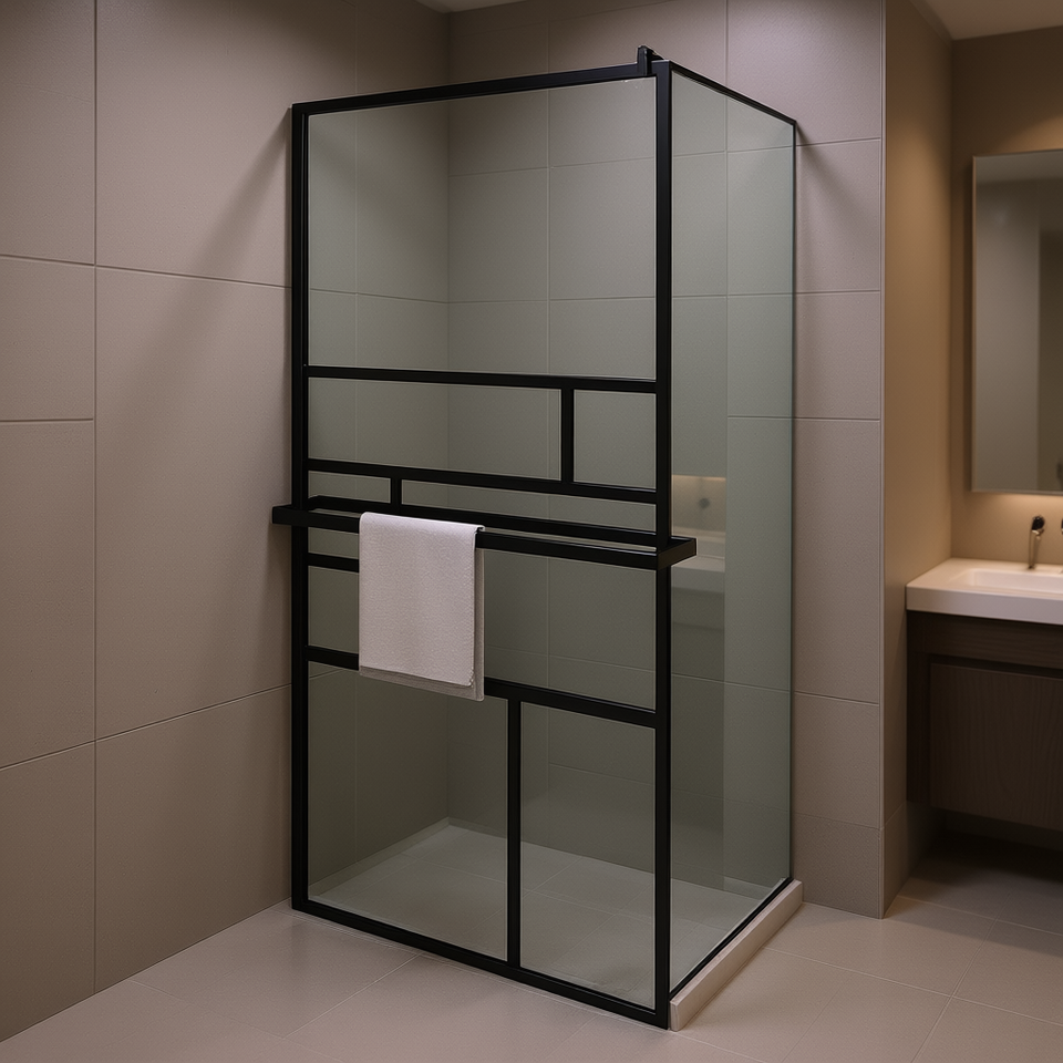 Black Walk In Shower Wall With Shelf 39.4x76.8 Inches Rectangular Minimalist Design For Shower Room