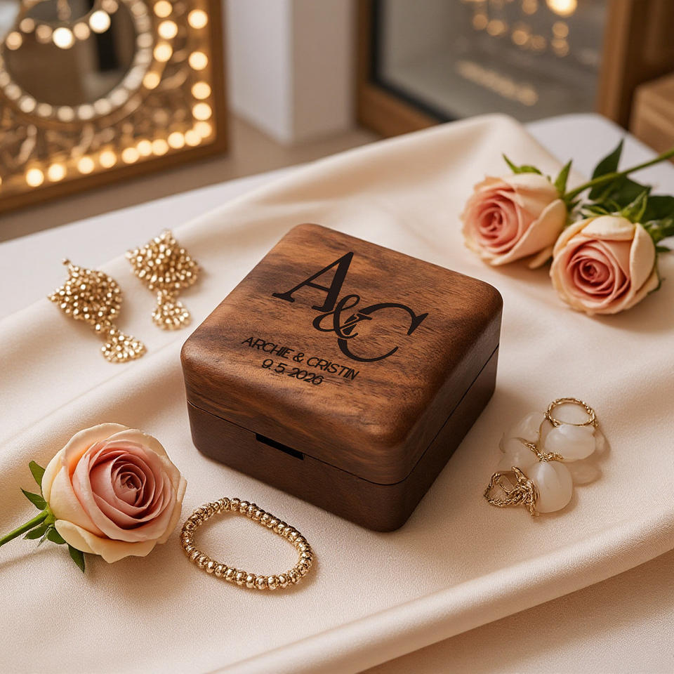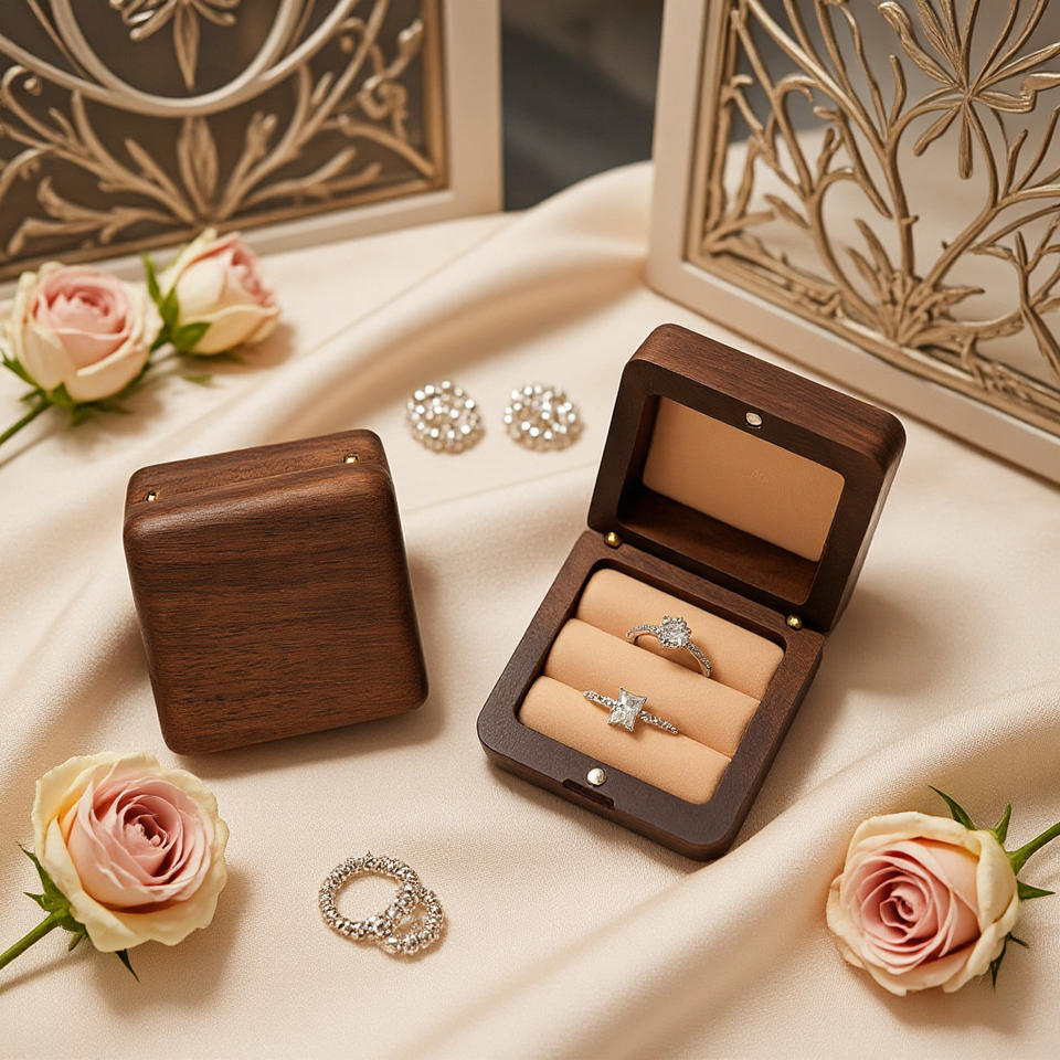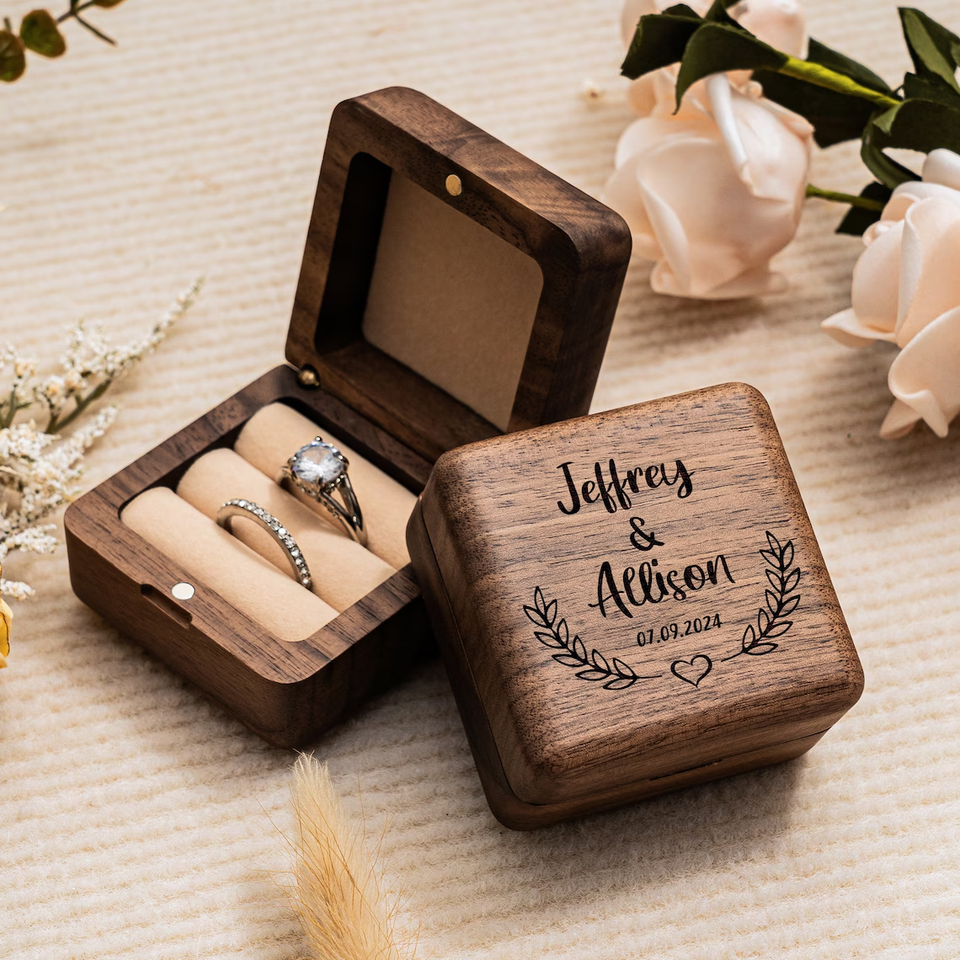 Boîte à bagues en noyer noir, double emplacement pour bagues, boîte de rangement pour demande en mariage, cadeau de mariage personnalisé gravé