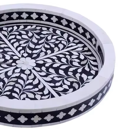 Plateau rond en os incrusté noir et blanc | Plateau décoratif fait main avec incrustations florales | Décoration d'intérieur Art Déco de luxe | ENTREPRISES PARFAITES