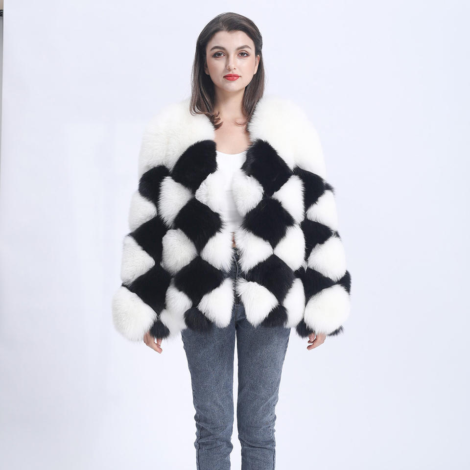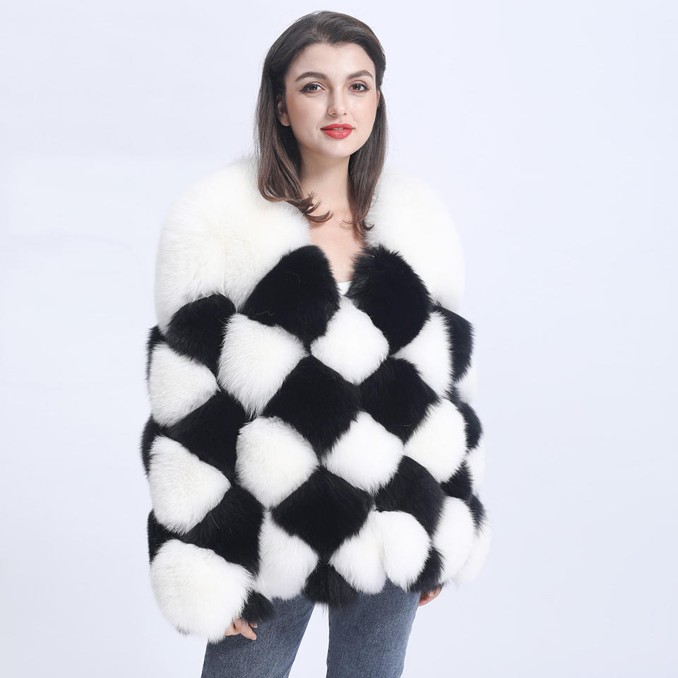 Blouson aviateur en vraie fourrure de renard, motif quadrillé noir et blanc, grande taille, pour femmes