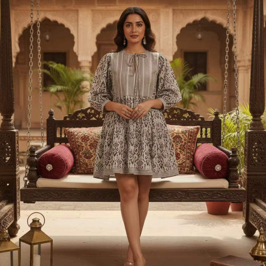 Robe midi imprimée numérique noir et blanc, tunique d'été courte en coton pour femme, style ethnique bohème, robe indienne artisanale naturelle lavable