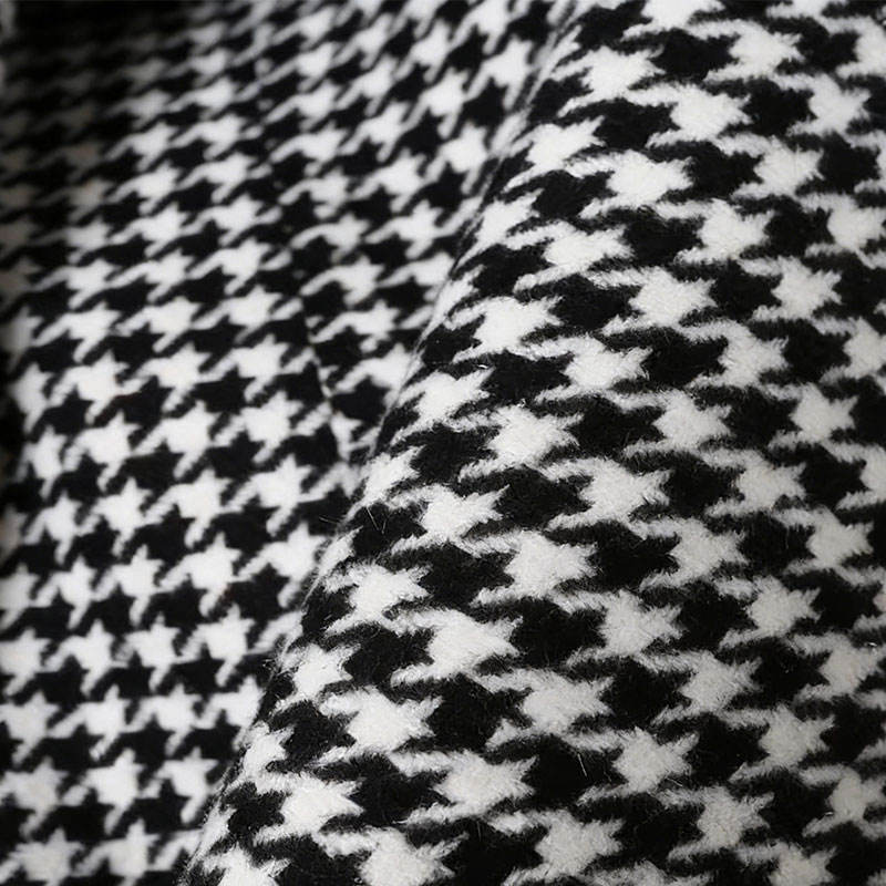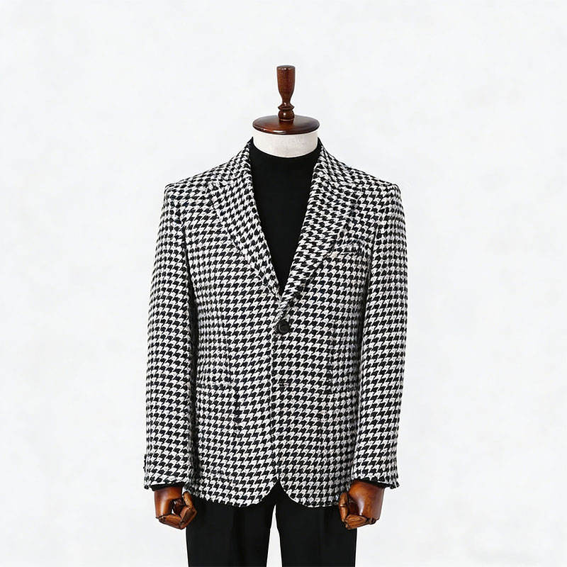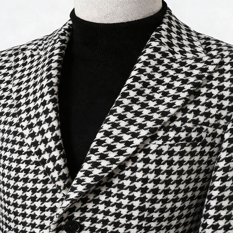 Blazer homme noir et blanc à motif pied-de-poule en polyester, tissu polyester infroissable, motif rétro classique pour un style décontracté