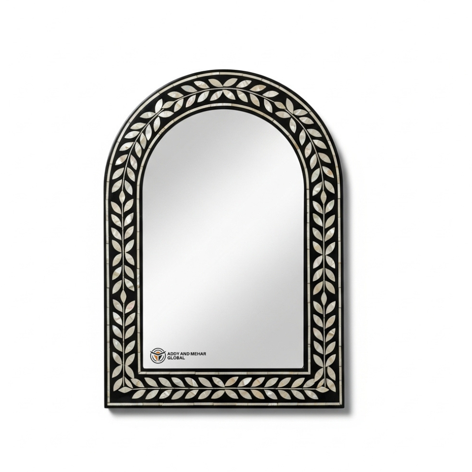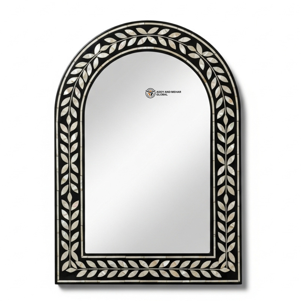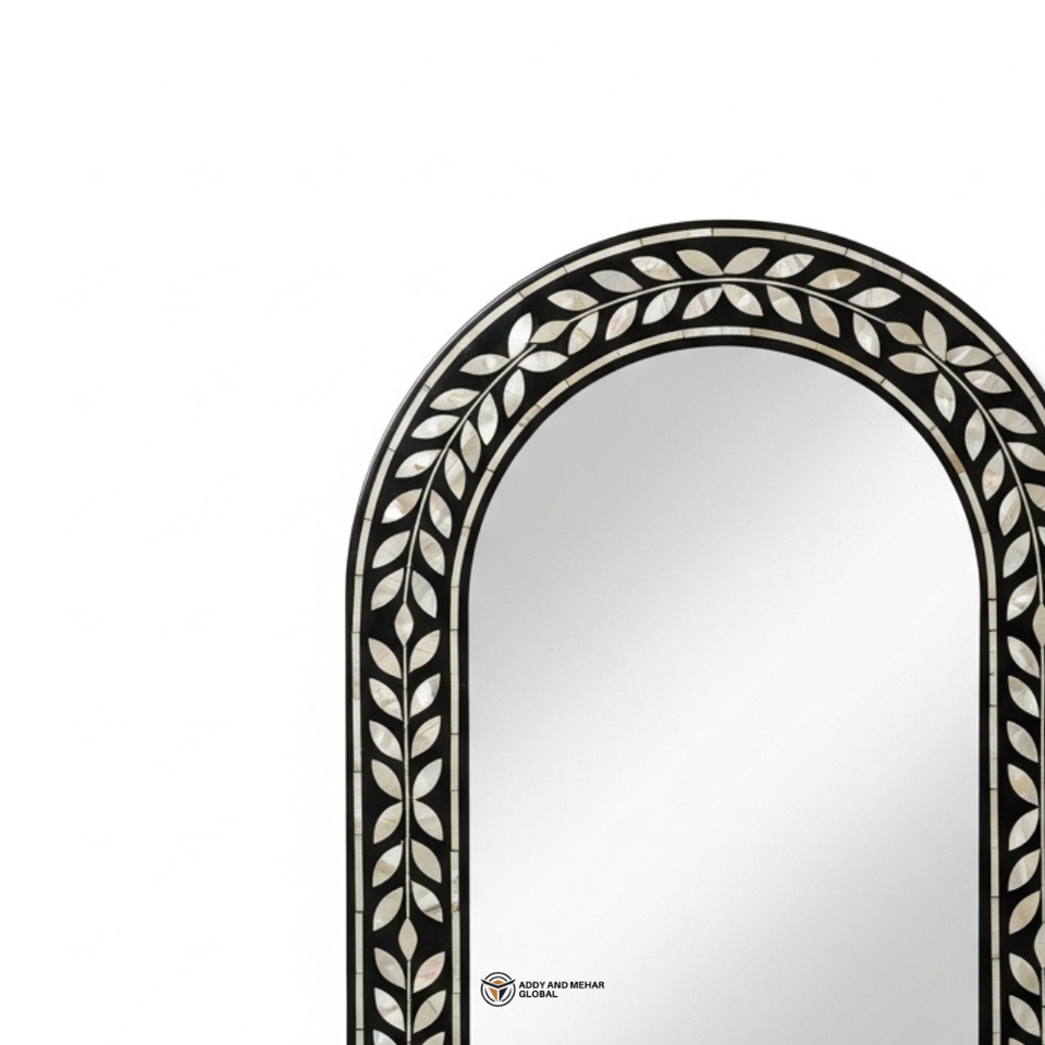 Miroir en forme d'arche avec incrustation de motifs de feuilles noirs et blancs – Décoration murale de luxe faite à la main