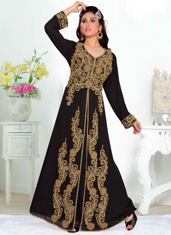 Black embroidered georgette islamic kaftans With Sun-proof hijab.