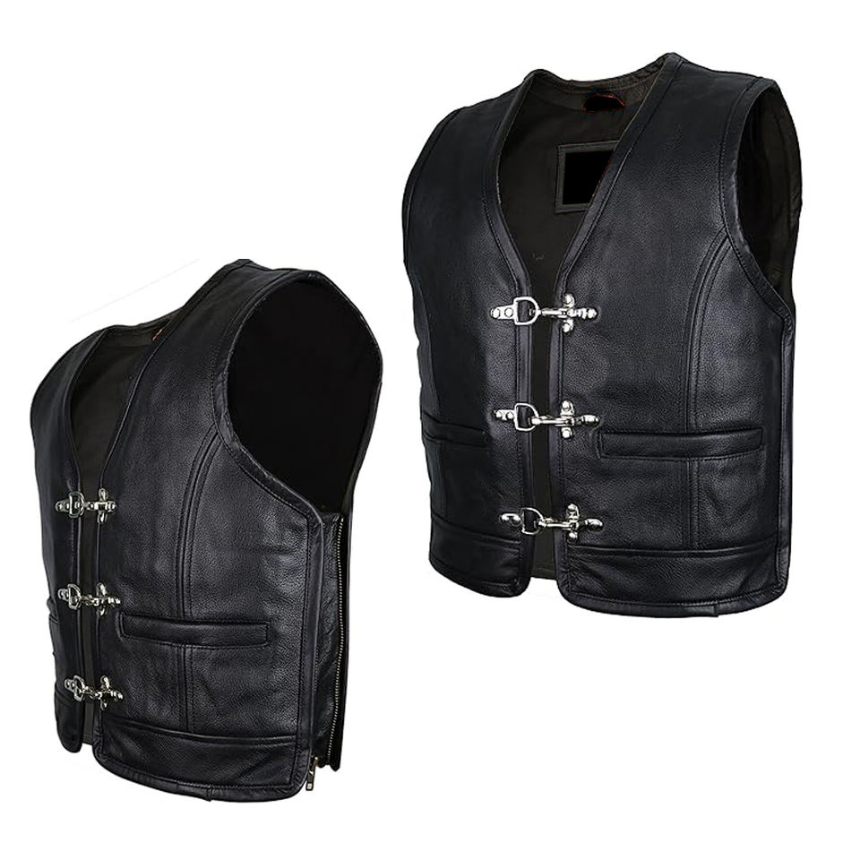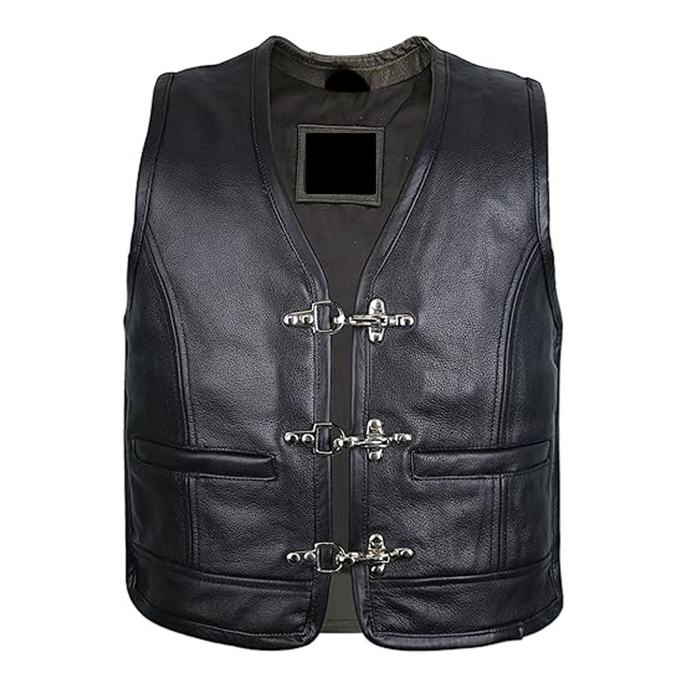 Black Genuine Cowhide Leather Biker Vest Covered Button Closure No Middle Back Autumn Breathable Outer Wear Vintage Men's
