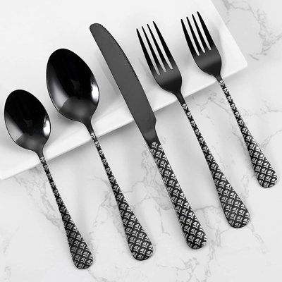 Ensemble de couverts noirs à motifs avec un design audacieux, expérience culinaire moderne, style de table haut de gamme pour restaurant.