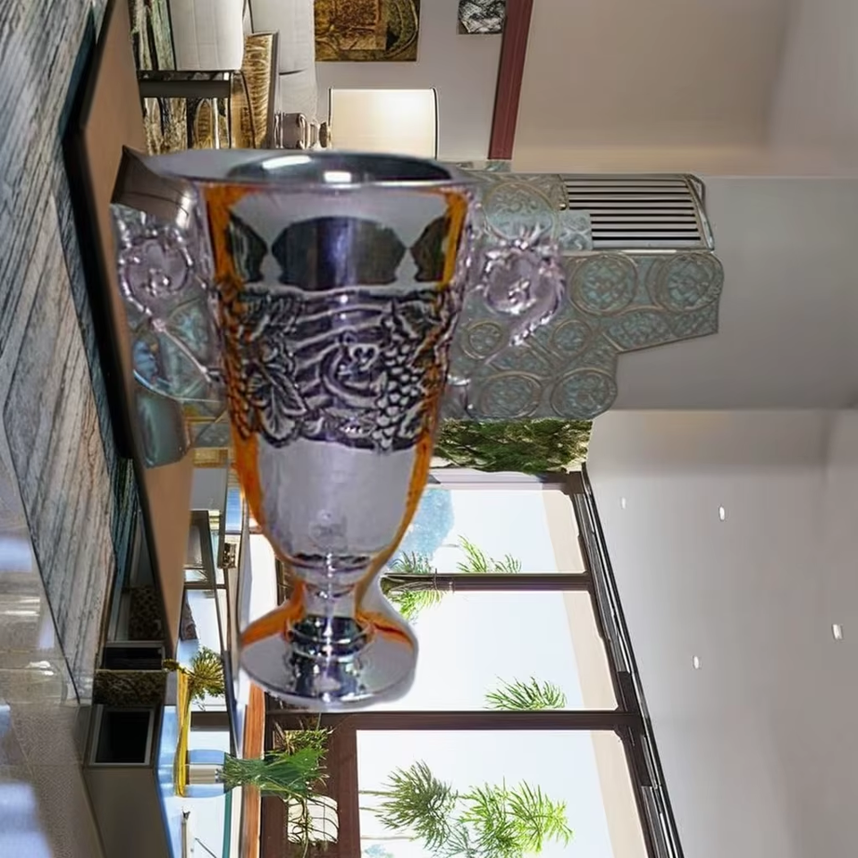 Pot de fleurs auto-arrosant en acier inoxydable de style américain moderne, résistant à la rouille, avec support blanc et table haute sur pieds.