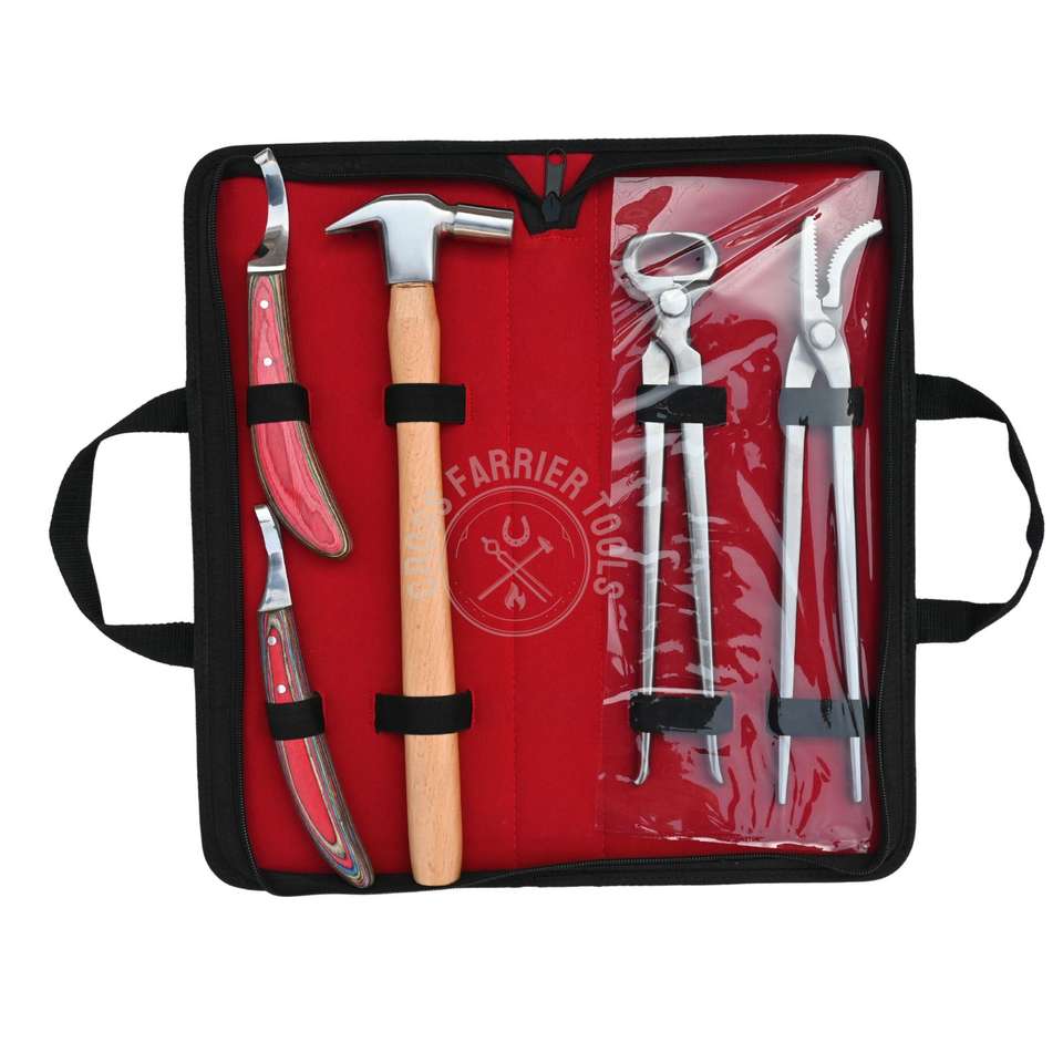 Kit d'outils de maréchal-ferrant pour équidés : Pince à sabots, Pince à clous, Couteau à sabots courbé, Couteau à boucle, Marteau à sabots pour abcès et pose de fer à cheval