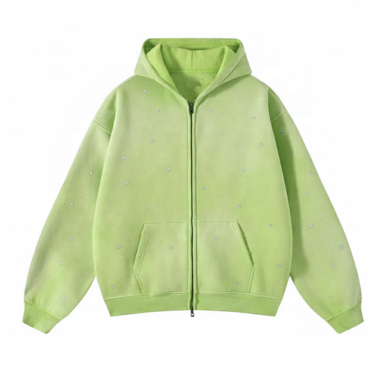 Sweat à capuche en coton French Terry délavé à l'acide, personnalisé, surdimensionné, avec strass, noir, coupe carrée, court, zippé, style Y2K pour homme
