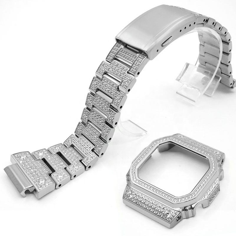 Bling bling glacé boîtier en diamant doré série de bracelet de montre en acier inoxydable et cadre boîtier en métal bracelet gwm5610 dw5600