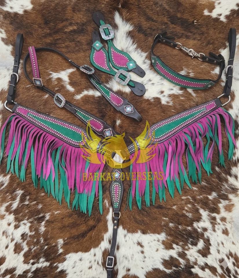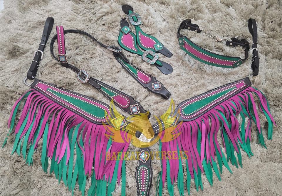Ensemble d'accessoires équestres en cuir véritable, style western saisonnier, léger, avec franges, strass et conchos argentés, rose et turquoise, Bling Tack