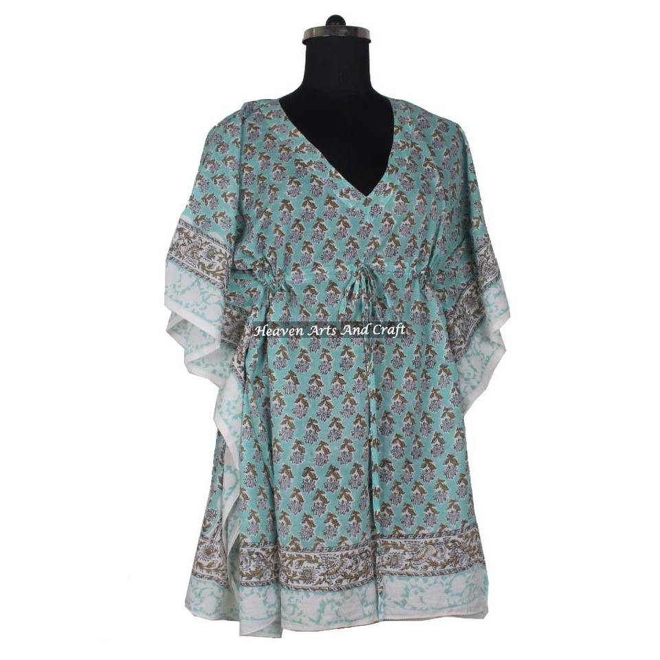 Kaftan long à col en V imprimé au bloc pour femme, 100 % coton biologique, par un créateur, le cadeau idéal pour elle, kaftan imprimé à la main