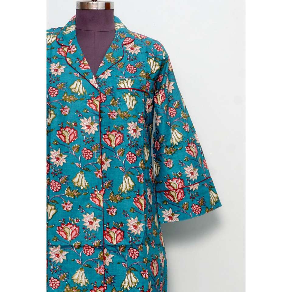 Robe chemise longue en coton pur 100% imprimée au bloc, col rabattu, manches longues, boutonnée sur le devant, style club, moderne et naturelle