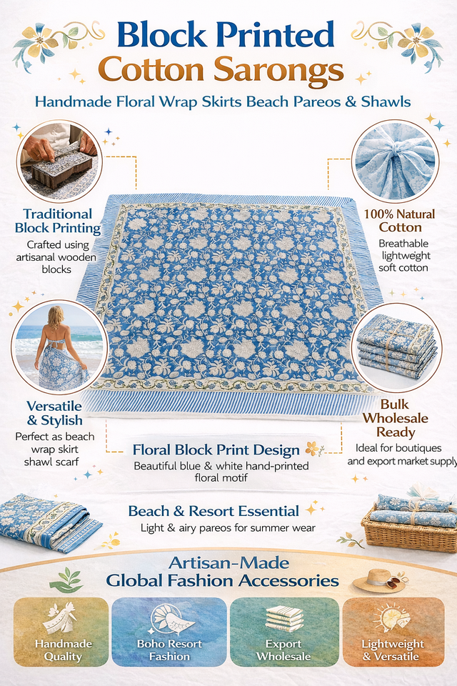 Block Printed Cotton Sarongs Handmade Floral Letter One-piece Wrap Pareo Scarf Shawl Beach Wear Wholesale Export Fashion