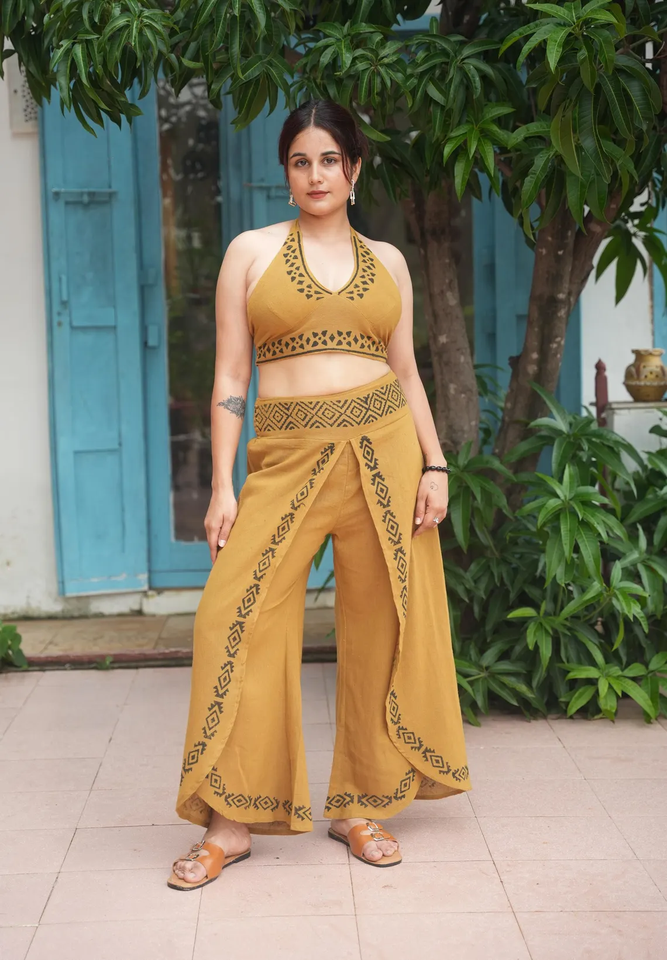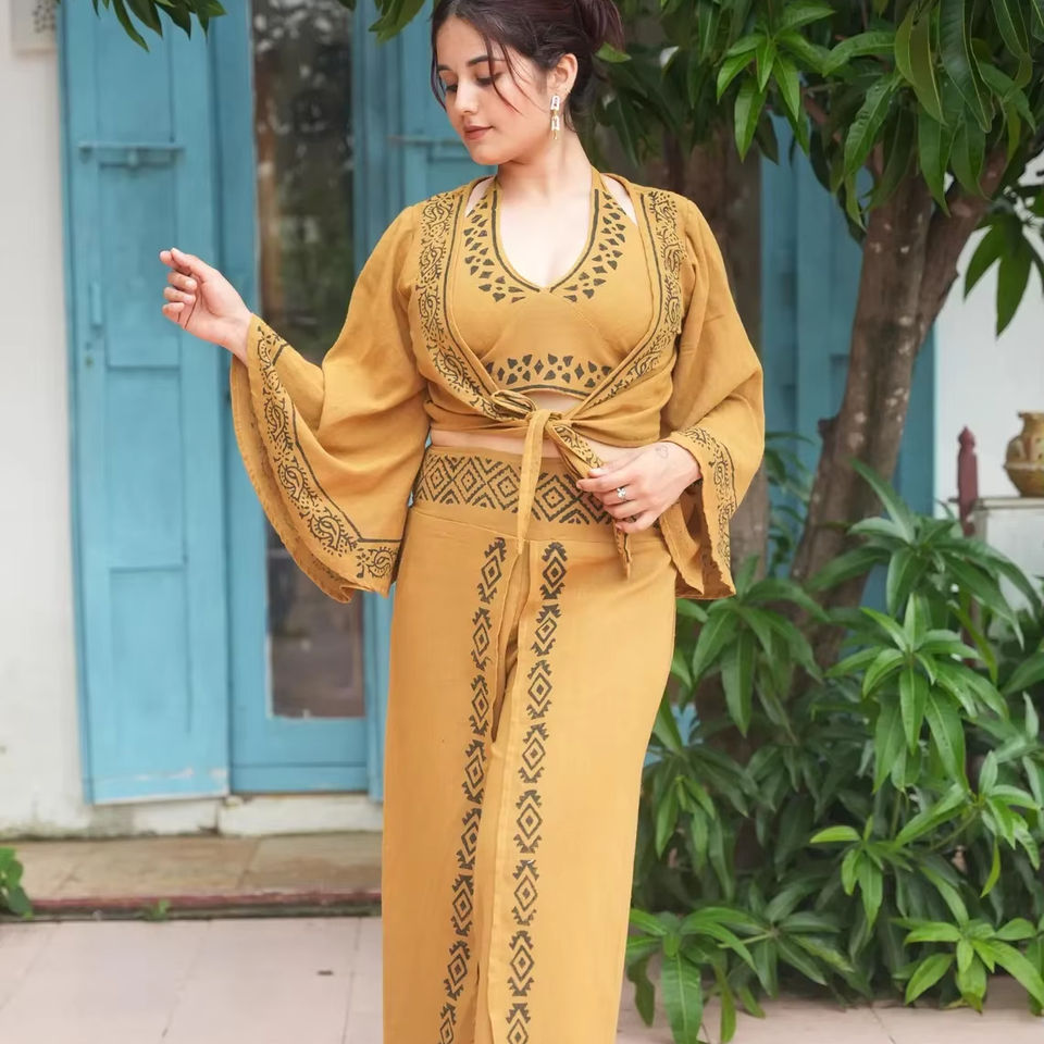Ensemble de pyjama imprimé bloc avec Kimono Mustard Tribal Boho Ensemble pantalon de pyjama à jambes larges