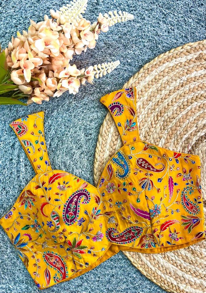 Blouse has zari and sequance work with position printe Blouse has back open pattern with huk Made Fashionable V-Neck