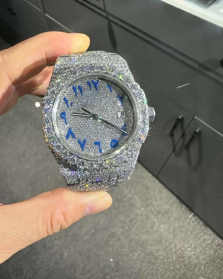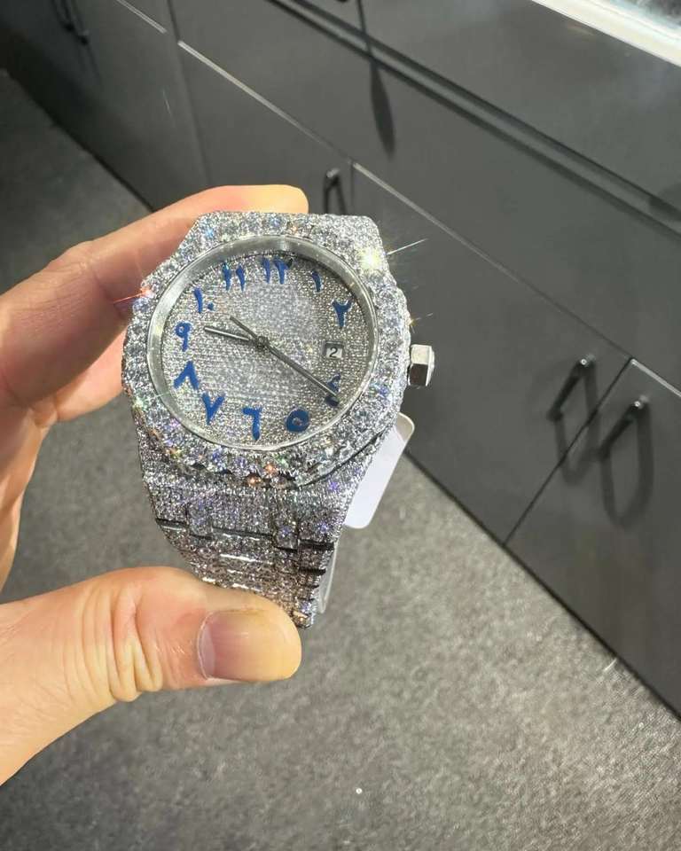 Montre automatique de luxe en acier inoxydable avec cadran arabe bleu, sertie de diamants VVS, style hip-hop, unisexe, qualité supérieure